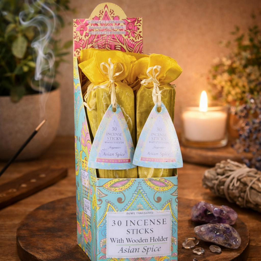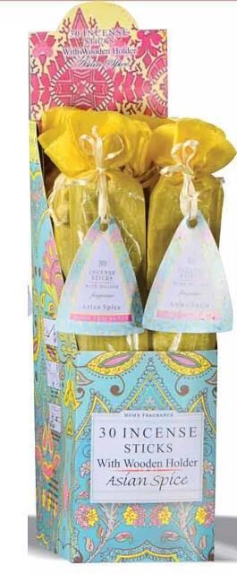 Home Fragrance Incense - Asian Spice Warm & welcoming with a hint of the exotic. Full Box Includes -set of 12 Packs 30 incense sticks in one packet. This item comes with a beautiful wooden incense holder as well. Sell very well as they present beautifully as a counter line. Number one gift range as it has something for everyone’s tastes. Box Included. Also available in the range: Vanilla Honey - A delicate golden honey gently folded with rich, warm vanilla. Rose - It takes you into the heart of the rose as kissed by the morning light. Jasmine - A seductive scent used for centuries to entice. Lavender - A calming yet well rounded scent for the home. Patchouli - An earthy and herbaceous scent with a rich green heart and a woody base.